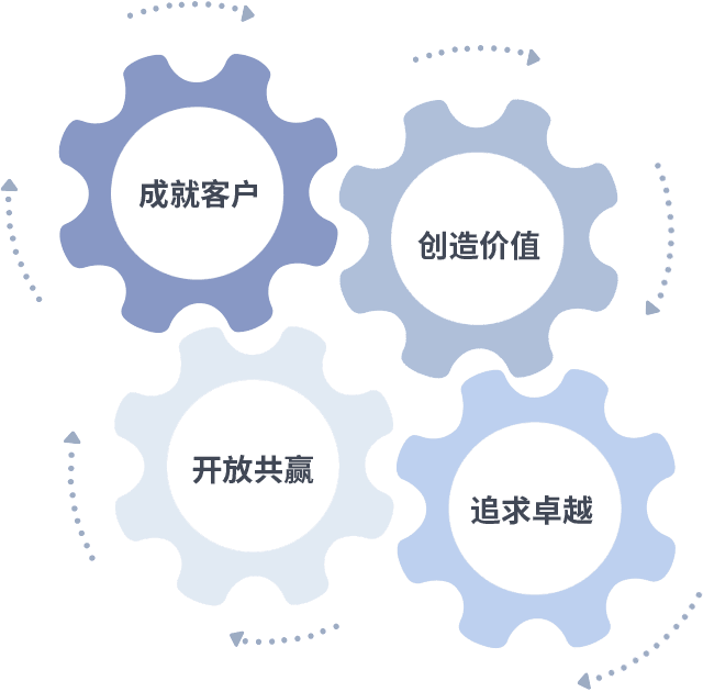 成就客户是一切决策的出发点,,,创造价值是衡量所有工作的标准,,追求卓越是我们做事做人的态度,,开放共赢是我们的格局也是最终的结果。。。价值观的齿轮环环相扣,,推动着组织里的每个人不断向前。。。