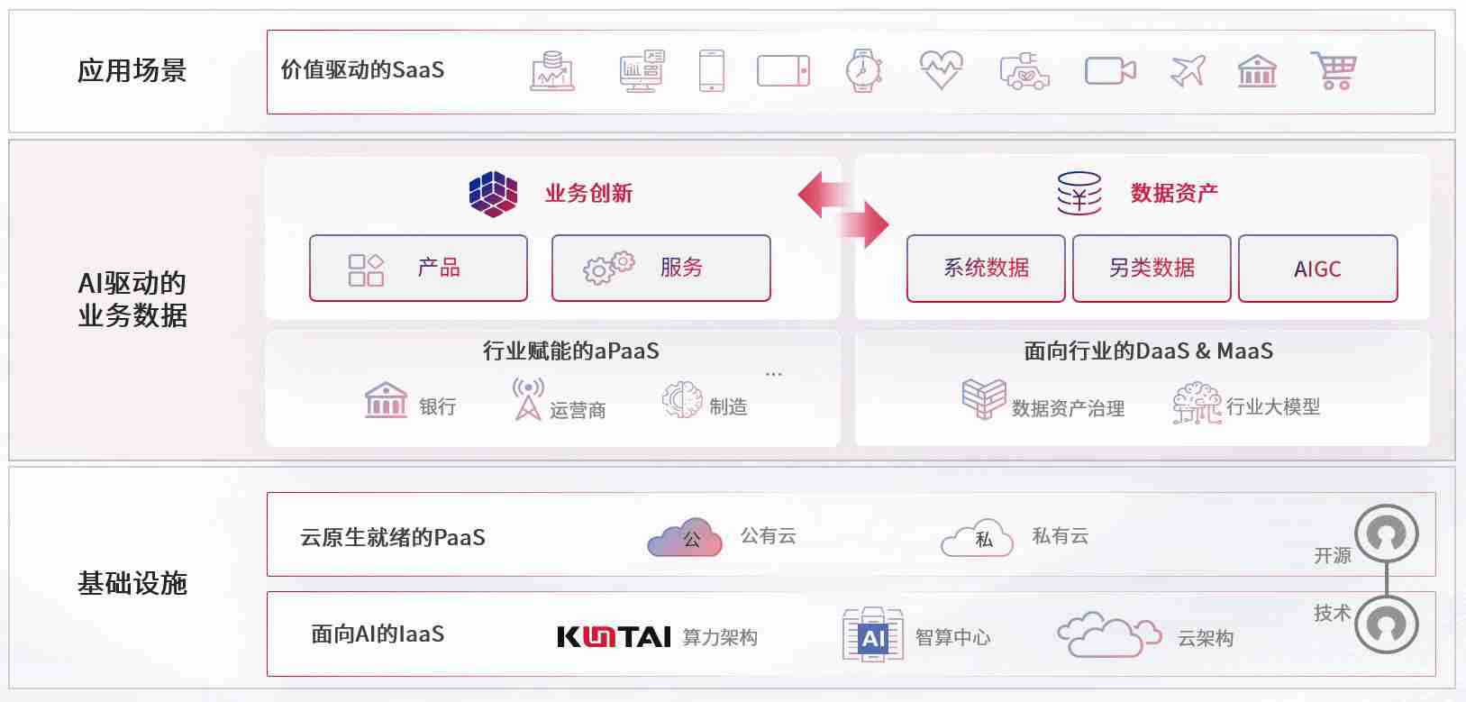 数字时代,,,,围绕企业数字化转型的关键要素,,开元数码开创性的提出数云融合战略和技术体系框架,,,着力在云原生、、、、数字原生、、、AI原生和信创产业上架构产品和服务能力,,为处在不同数字化转型阶段的快消零售、、汽车、、、、金融、、、医疗、、、政企、、教育、、运营商等行业客户提供泛在的敏捷IT能力和融合的数据驱动能力,,,构建跨界融合创新的数字业务场景和新业务模式,,,助力企业级客户建立面向未来的核心能力和竞争优势,,全面推动社会的数字化、、、智能化转型升级。。。