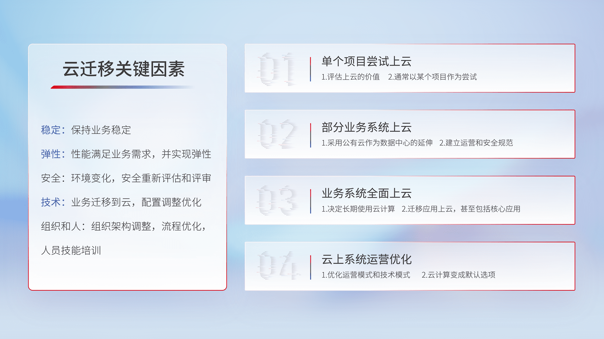 结合实际业务,,,从规划设计、、、云平台选型、、、云原生改造、、数据迁移、、集成交付,,迁移全过程为客户识别最佳上云路径,,做好风险识别管理,,,,设计网络架构、、、、身份权限、、、安全审计合规、、、、操作审计、、、、日志审计、、、监控告警策略、、、、多站点容灾设计等,,,对云上基础设施进行整体规划,,提升IT治理水平,,以满足弹性、、、高可用、、高性能的需求。。
