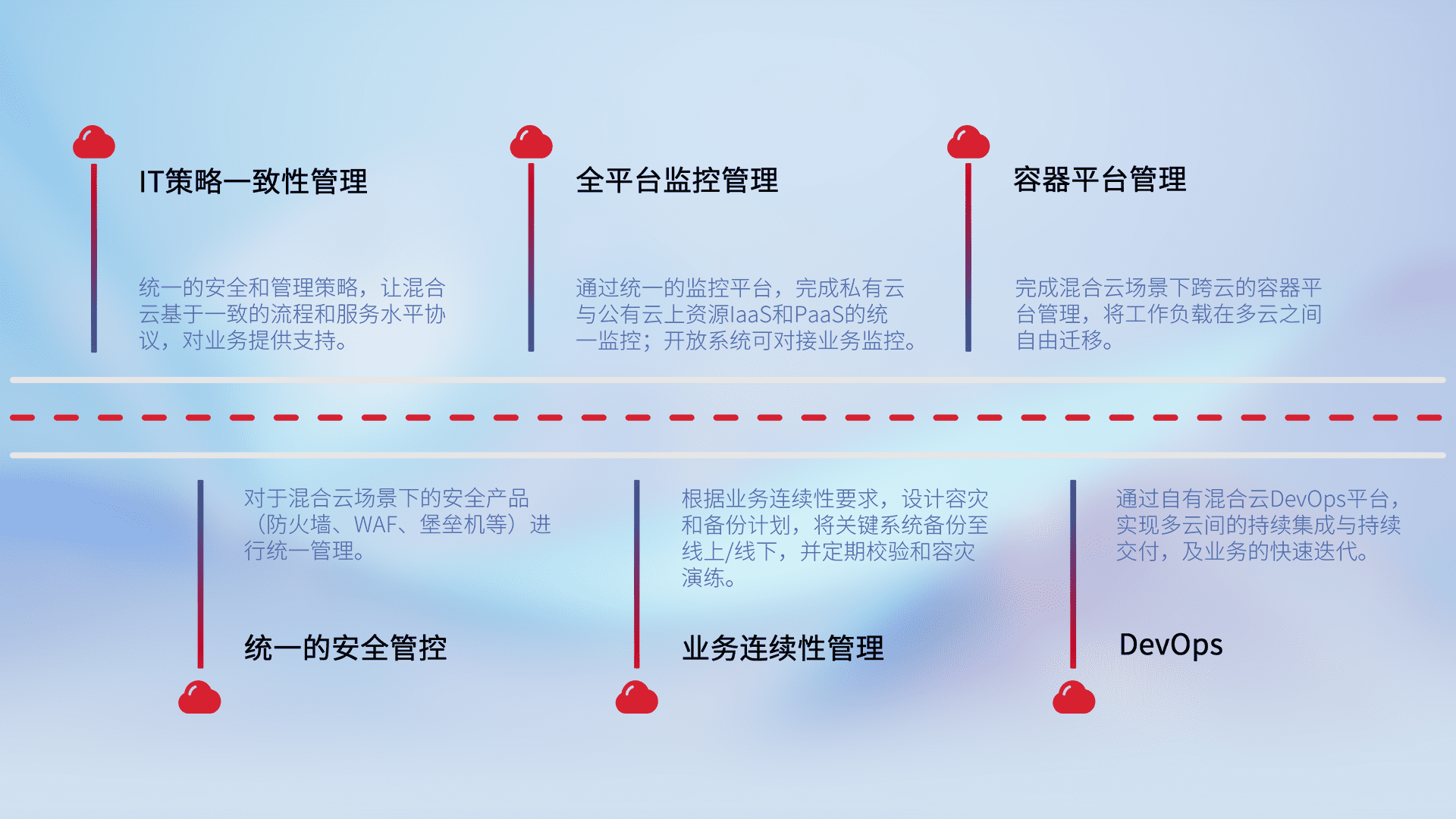 通过多云纳管,,,以统一的资源数据模型把客户的云资源进行抽象和封装,,,,进而实现对多云资源的统一操作,,,,保障云资源管理的可靠性、、、稳定性与可用性。。量身定制化运维内容,,,配置、、、开发运维、、补丁管理、、备份、、监控、、、认证和访问管理、、、审计和日常巡检等,,,,保障在用云过程中的可靠度,,稳定度以及高可用率。。。
